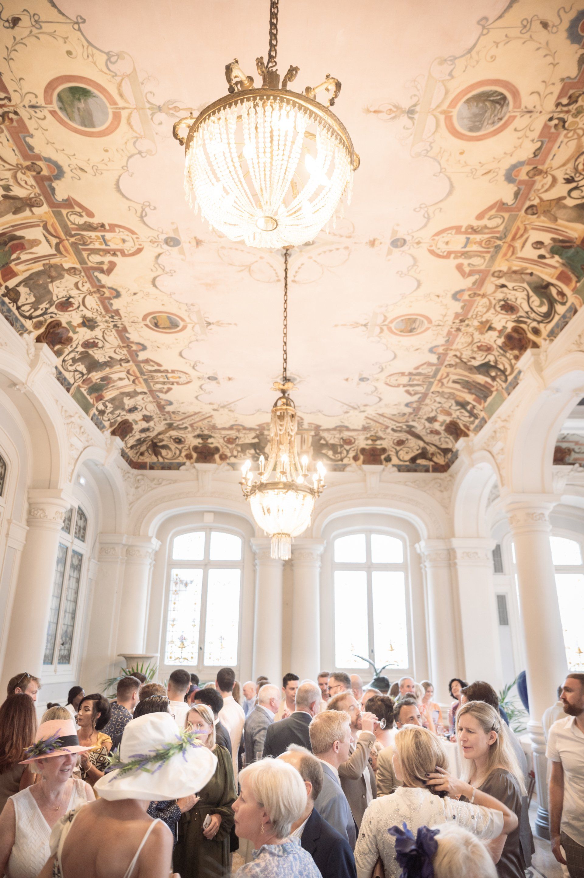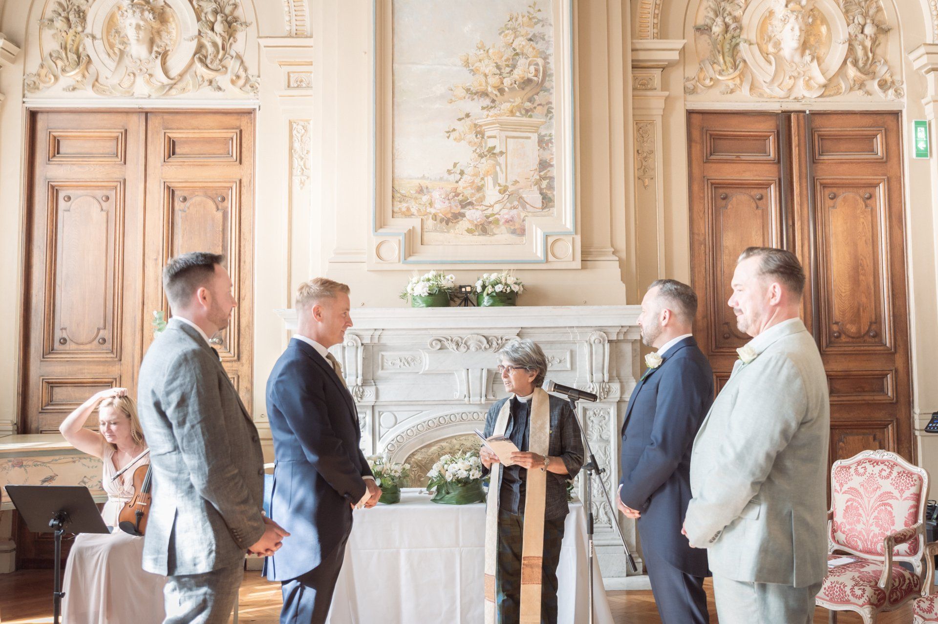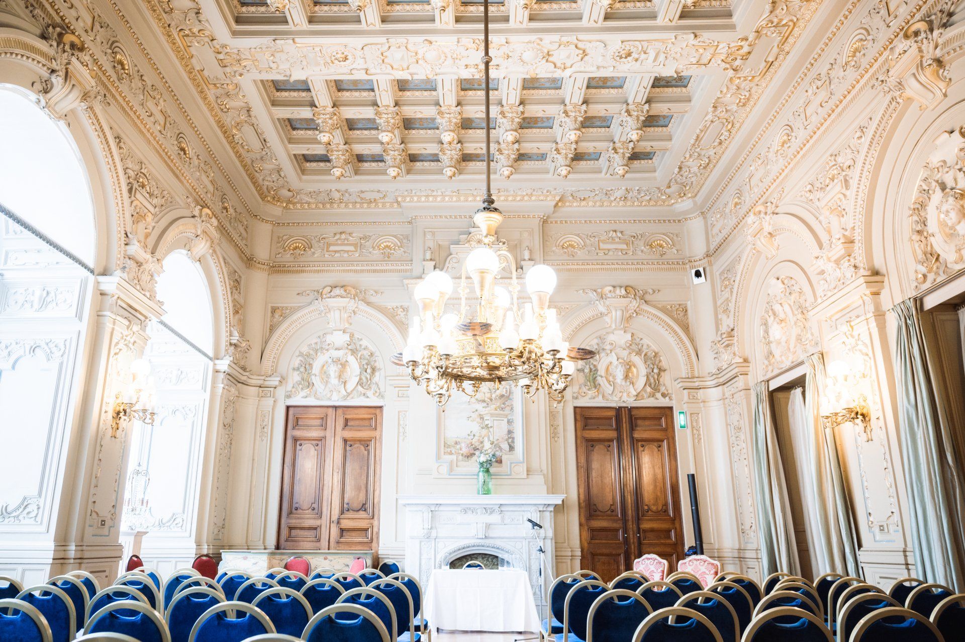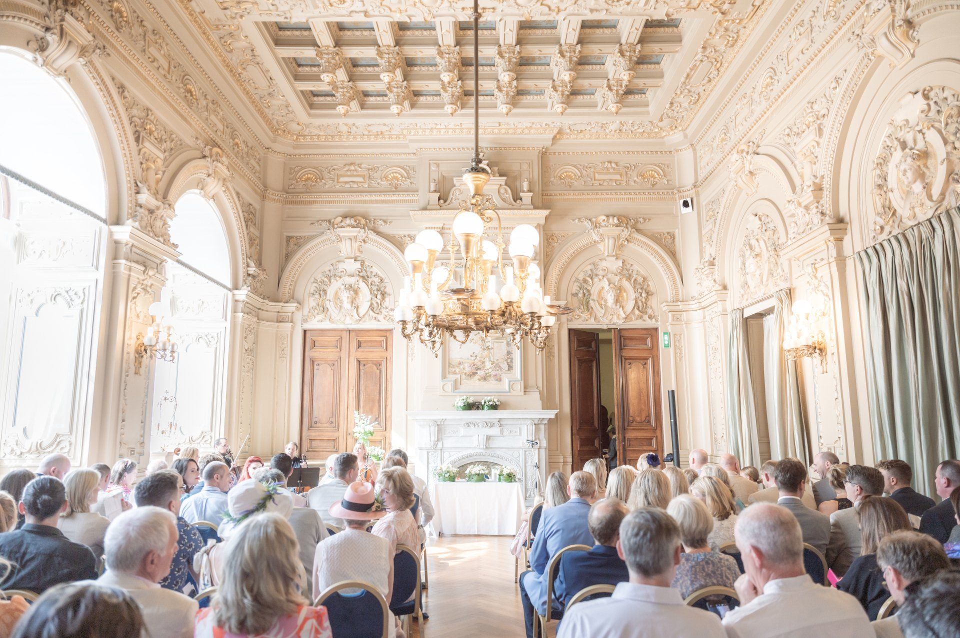 Inside are rooms adorned with fresco paintings and exquisite wood-carved décor, the calm ambience of which contrast markedly with the bustling promenade outside. It's the perfect setting for wedding ceremonies and this particular ceremony at benefited from a fabulous string quartet, amazing flowers, and three particularly beautiful rooms, one each for the ceremony, cocktail hour, and dinner.