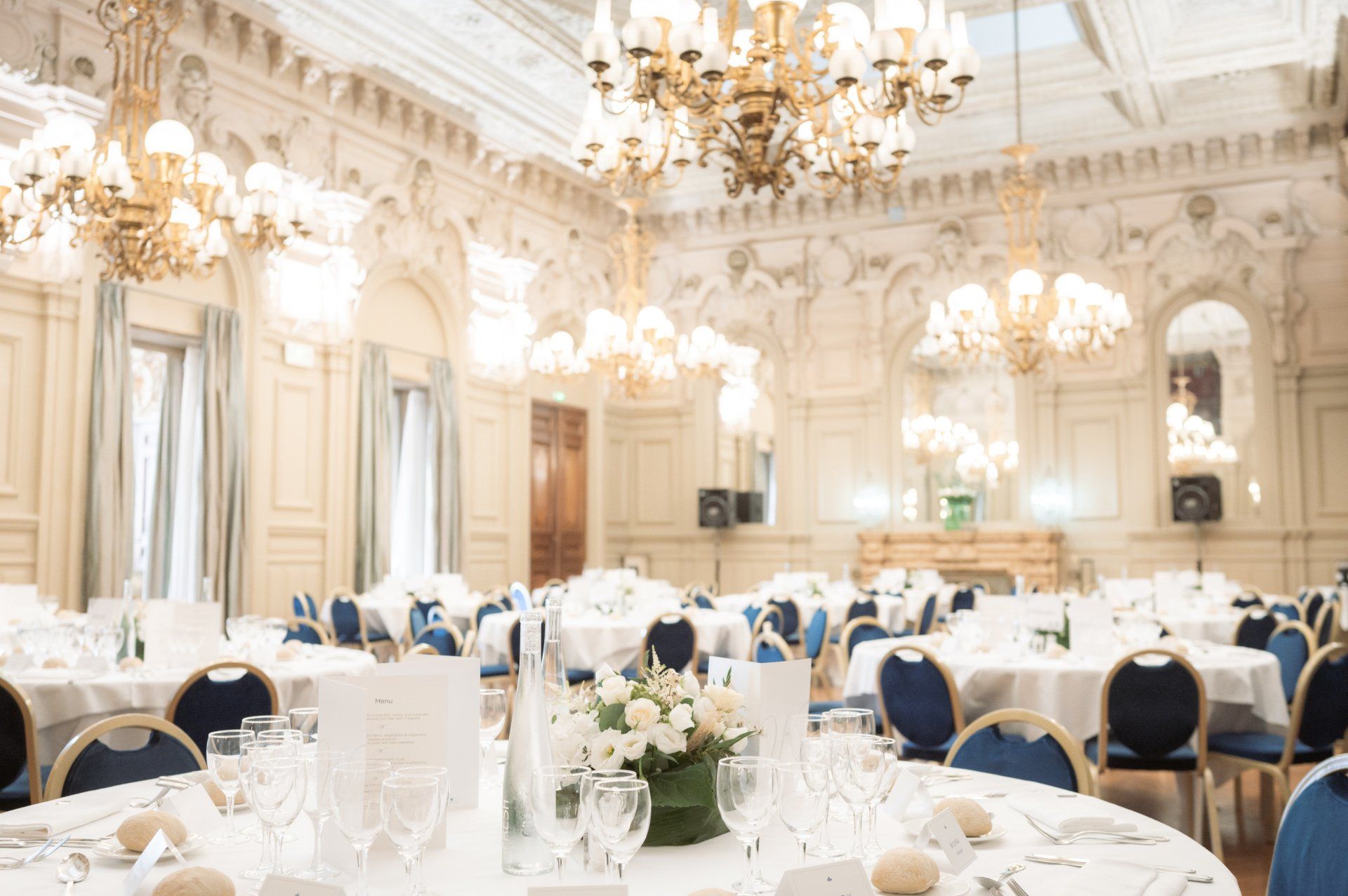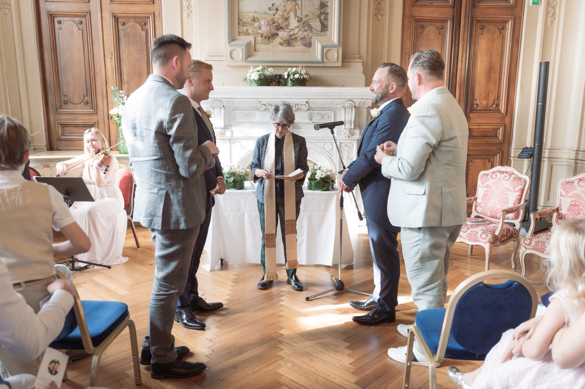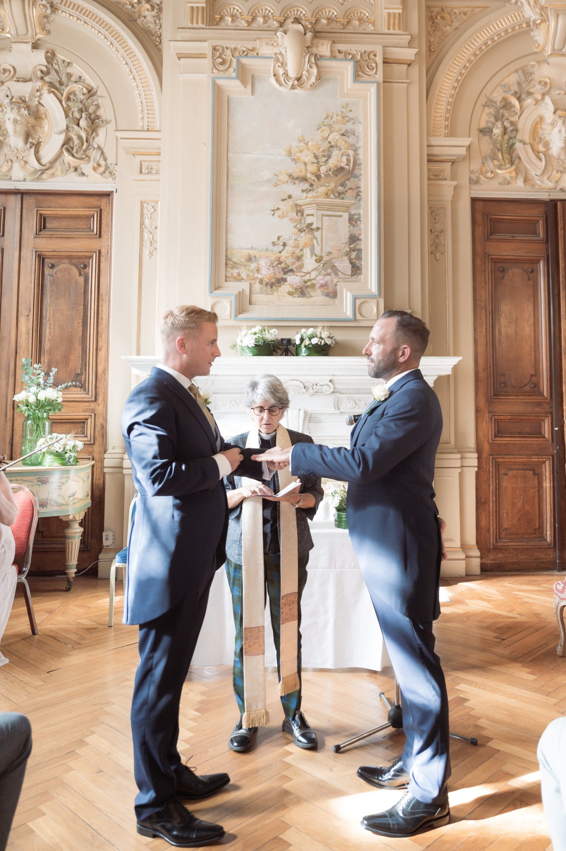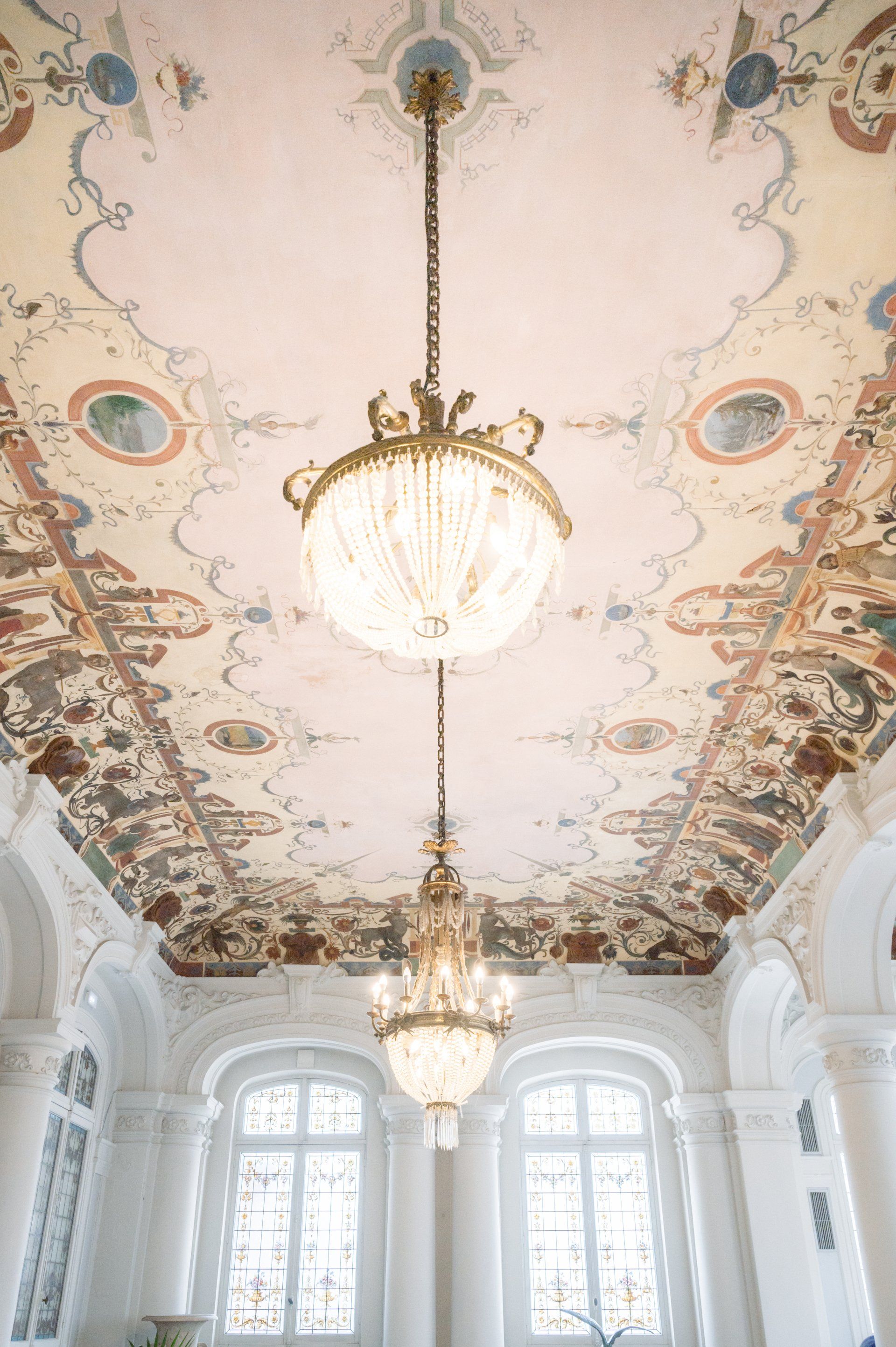 Inside are rooms adorned with fresco paintings and exquisite wood-carved décor, the calm ambience of which contrast markedly with the bustling promenade outside. It's the perfect setting for wedding ceremonies and this particular ceremony at benefited from a fabulous string quartet, amazing flowers, and three particularly beautiful rooms, one each for the ceremony, cocktail hour, and dinner.