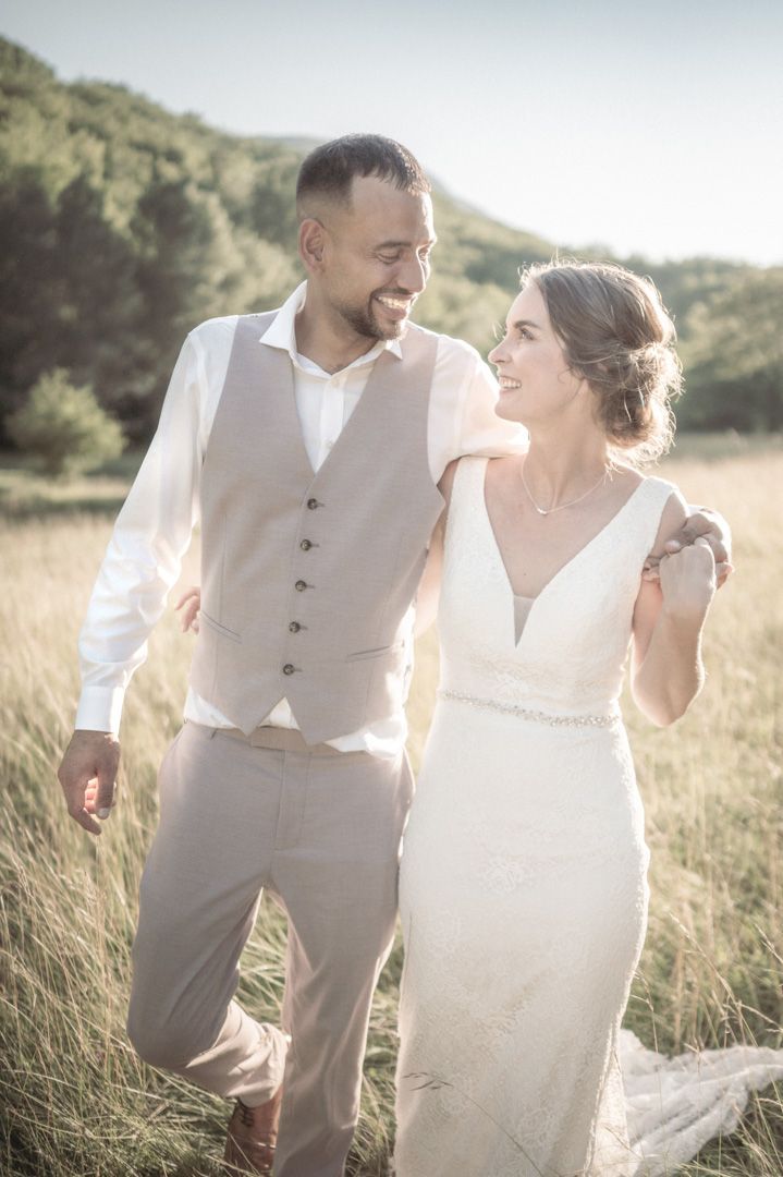 The outdoor space at Le Foulon is perfect for a wedding ceremony, as it is partially shaded by trees and positioned so that the sun is not in the way. For the evening shoot, we used a nearby field to take advantage of the sun's directional light before it dipped below the towering cliffs of the Alps that line the site in the distance.