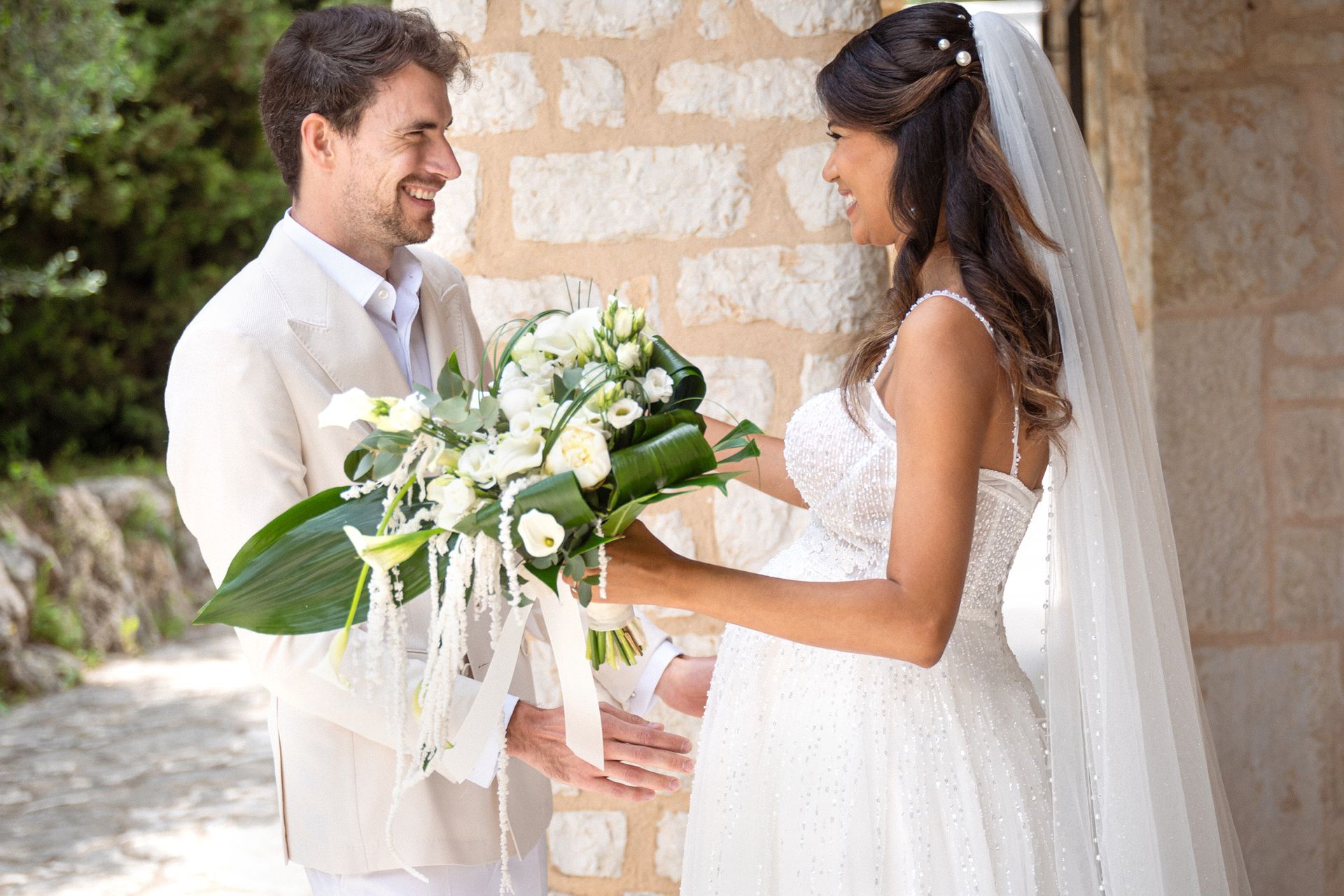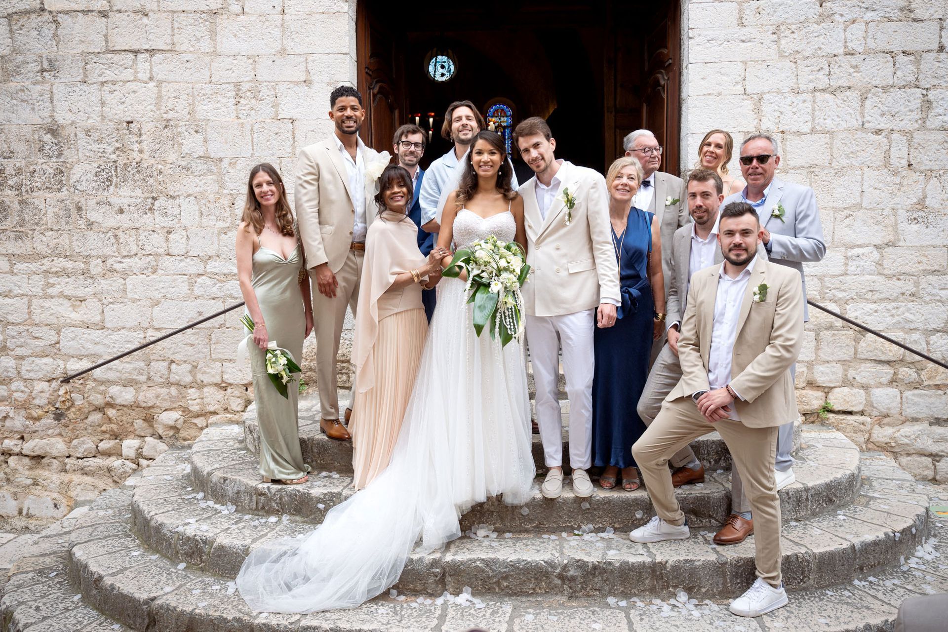 Le charmant village de Saint-Paul-de-Vence, sur la Côte d'Azur, a servi de décor photogénique à ce magnifique mariage provincial, avec une cérémonie civile et une cérémonie religieuse au cœur de son charmant village médiéval.
