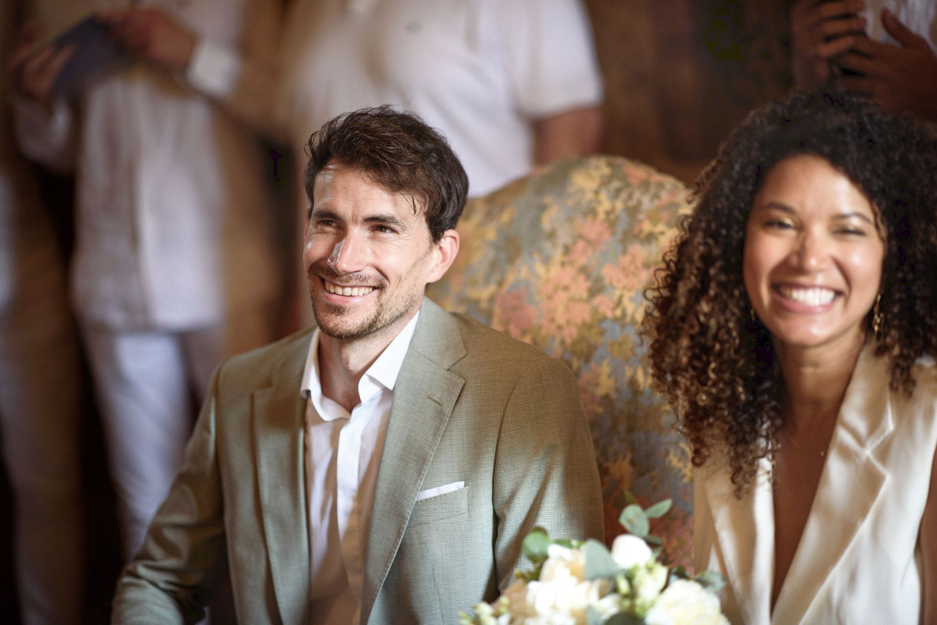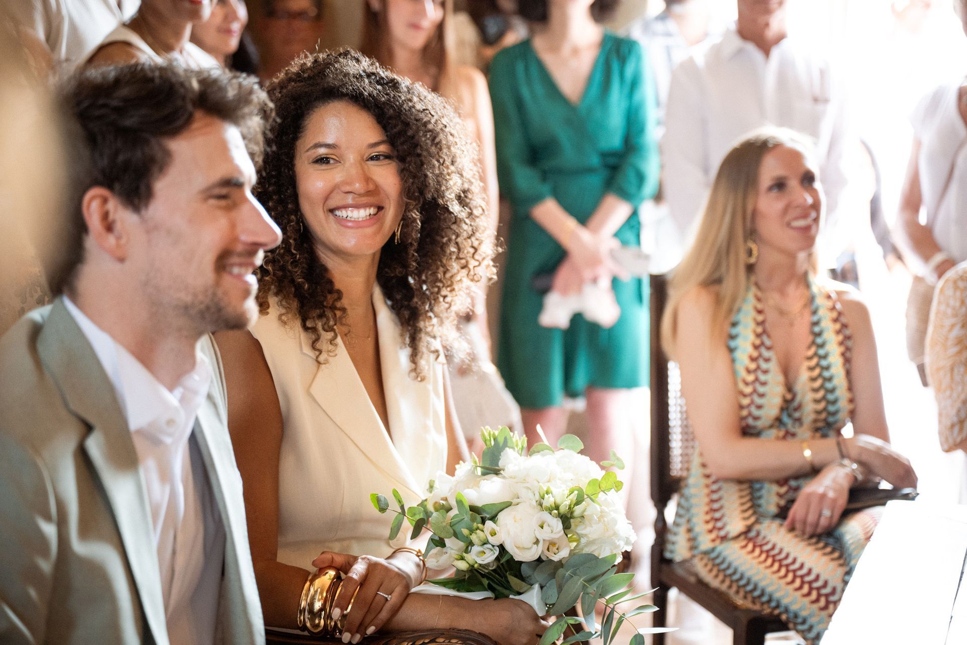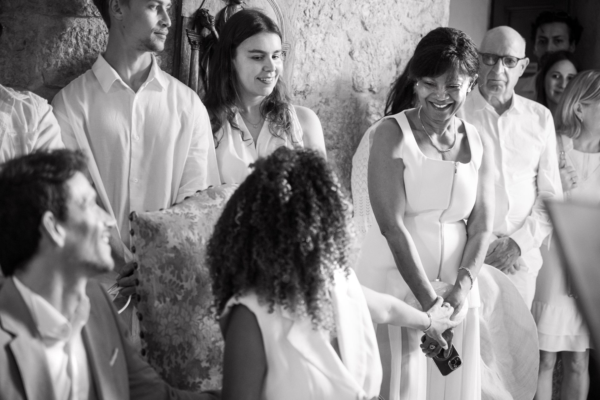 La belle lumière dorée du soleil se reflétait sur les pierres couleur miel et illuminait les invités réunis dans ce petit espace. C'est l'une des salles de mariage civil les plus uniques que j'ai photographiées, et cet endroit dégage quelque chose de merveilleusement optimiste, sachant que ses murs ont été témoins de milliers de cérémonies de ce type au cours des siècles (même si le bâtiment lui-même n'est utilisé à des fins civiles que depuis le XVIIe siècle).