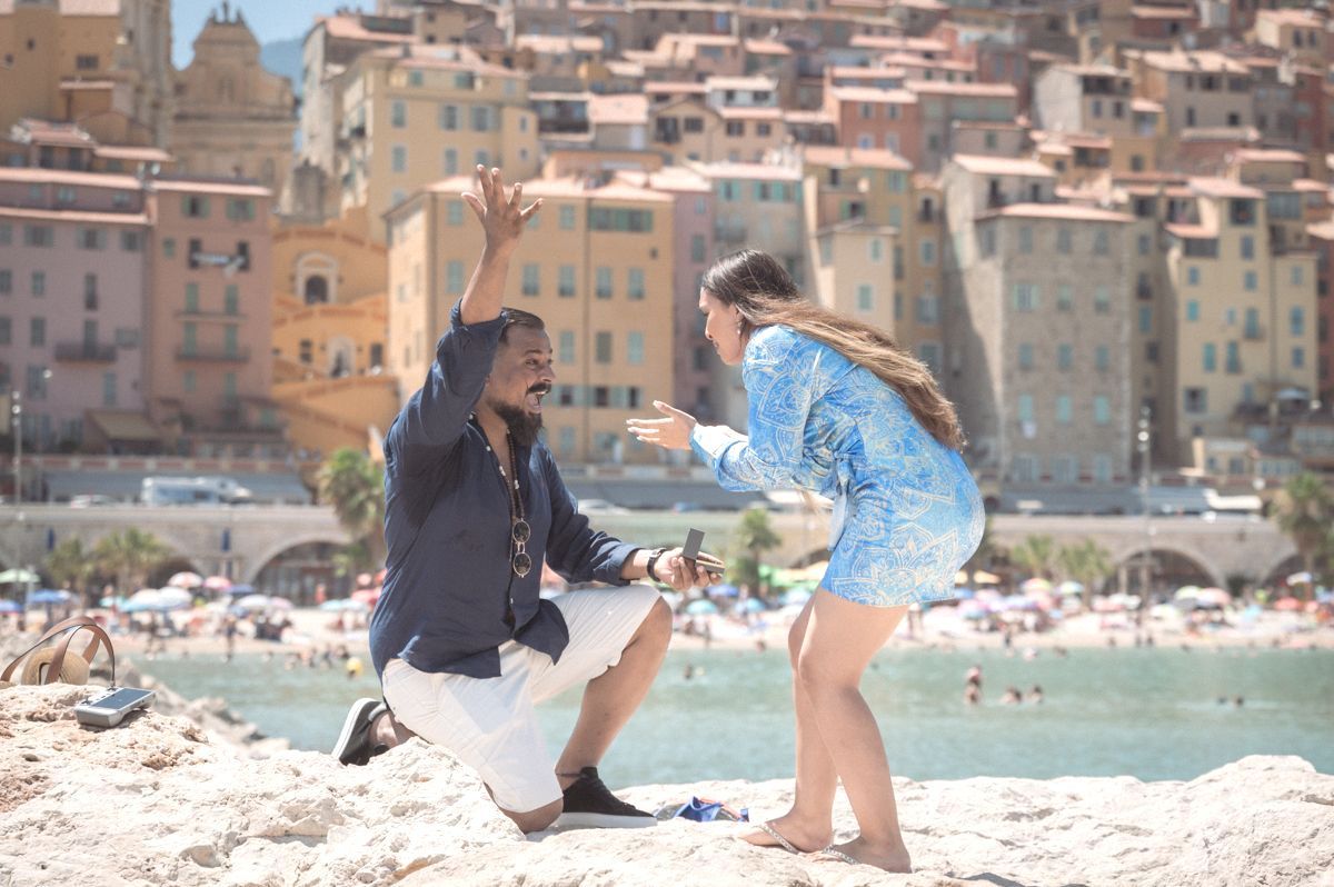 Logistically, getting yourself, your partner, and the photographer all in the right place and facing the right directions at the right time will take some planning and coordination, but the resulting images will be worth it. With this sequence we had organised various subtle cues, which, when combined with WhatsApp, made it possible. If you’d like to discuss your proposal on the French Riviera, please get in touch and I’ll see how I can help.